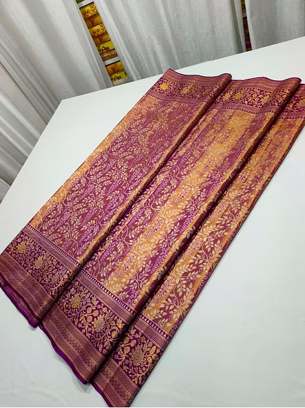 Intricate Meenakari WorkAdorned with exquisite Meenakari work, this saree exudes traditional charm and modern sophistication. Each detail is a testament to skilled craftsmanship and exquisite artistry.